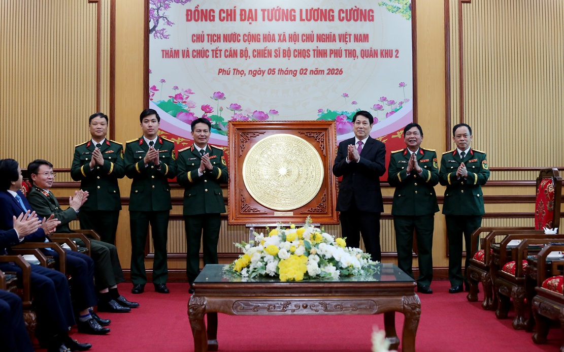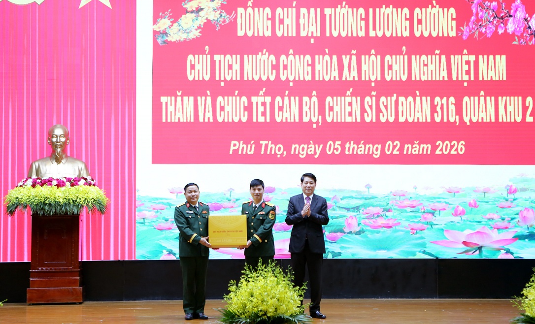 Sáng ngày 5/2/2026, Chủ tịch nước Lương Cường và Đoàn công tác Trung ương đã đến thăm, chúc Tết cán bộ, chiến sĩ lực lượng vũ trang Quân khu 2, Bộ CHQS tỉnh Phú Thọ và Sư đoàn 316 (Quân khu 2).