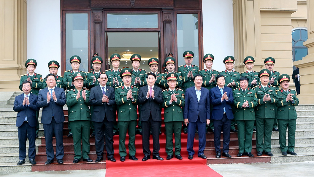 Chủ tịch nước Lương Cường cùng Đoàn công tác chụp ảnh lưu niệm với các đồng chí lãnh đạo Bộ CHQS tỉnh