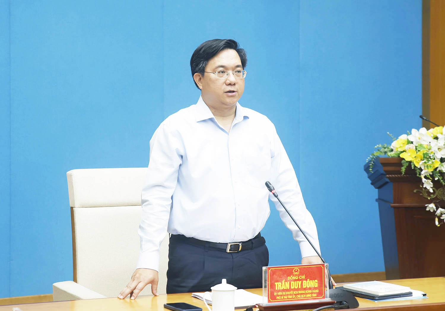 Chủ tịch UBND tỉnh, Trưởng Ban Tổ chức Giỗ Tổ Hùng Vương Trần Duy Đông phát biểu chỉ đạo tại hội nghị