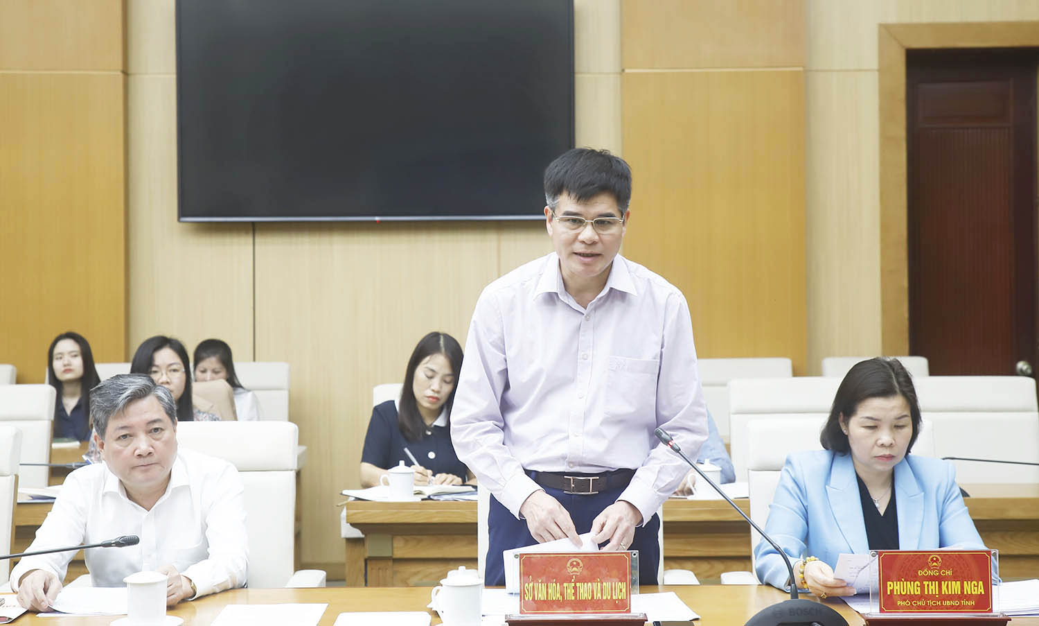 Phó Chủ tịch UBND tỉnh Phùng Thị Kim Nga phát biểu ý kiến về nội dung tổ chức Hội trại văn hóa trong khuôn khổ Giỗ Tổ Hùng Vương năm 2026