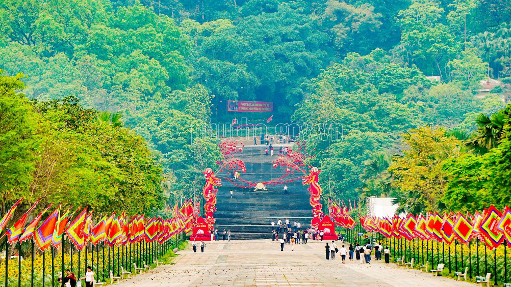 Những bậc đá dẫn lên các đền phủ sắc đỏ cờ hoa, tôn lên vẻ linh thiêng của vùng đất cội nguồn