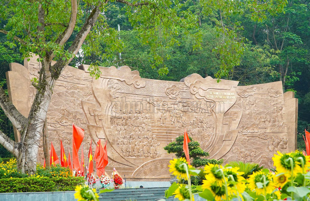 Bức phù điêu “Bác Hồ nói chuyện với cán bộ, chiến sĩ Đại đoàn Quân Tiên Phong” được tôn tạo trang trọng tại khu vực Ngã 5 Đền Giếng