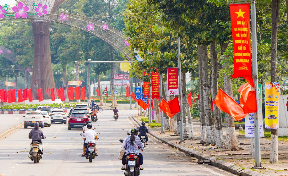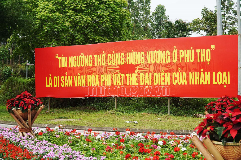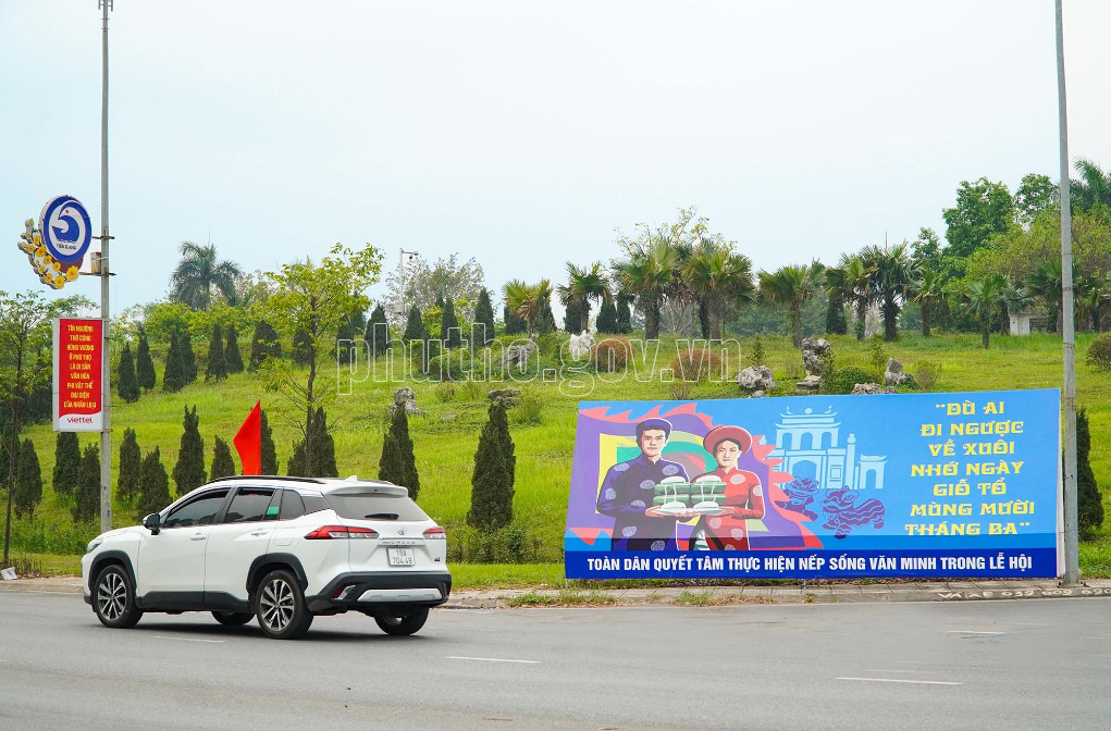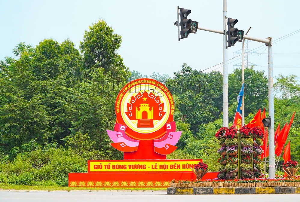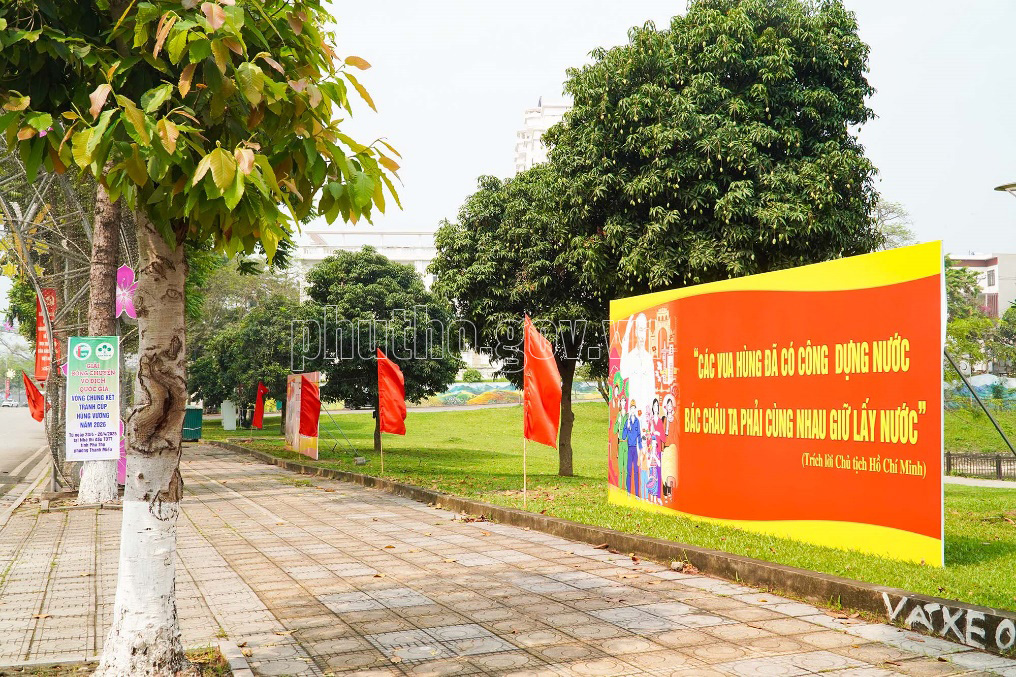 Các tuyến đường dẫn về Đền Hùng rợp sắc cờ hoa, sẵn sàng đón du khách hành hương về với cội nguồn