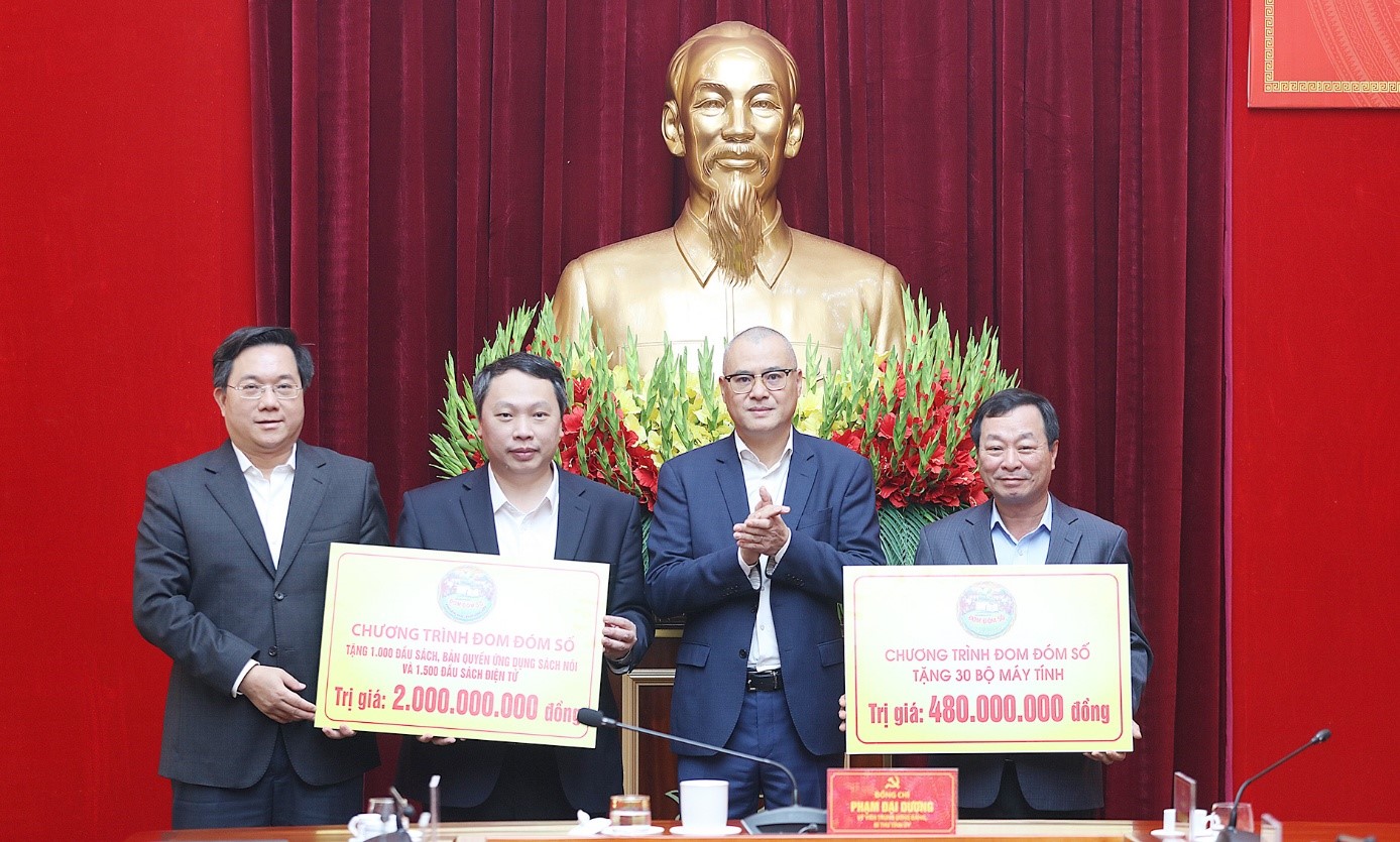 Đồng chí Nguyễn Huy Dũng - Ủy viên chuyên trách Ban Chỉ đạo Trung ương về Phát triển khoa học, công nghệ, đổi mới sáng tạo và chuyển đổi số trao biểu trưng máy tính và đầu sách, ứng dụng sách nói cho tỉnh Phú Thọ