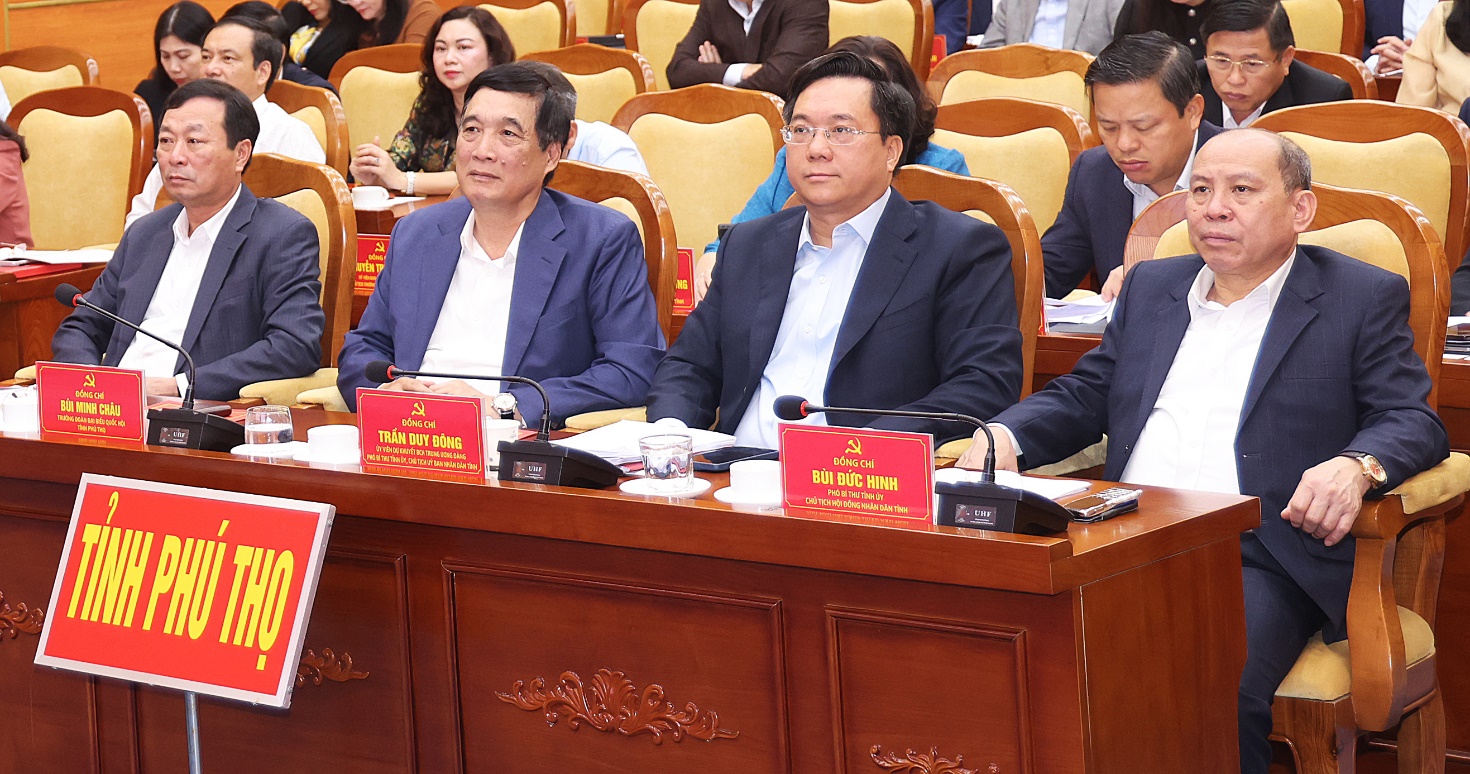 Dự hội nghị tại điểm cầu Tỉnh ủy Phú Thọ có các đồng chí: Trần Duy Đông - Ủy viên dự khuyết Ban Chấp hành Trung ương Đảng khóa XIV, Phó Bí thư Tỉnh ủy, Chủ tịch UBND tỉnh; Bùi Minh Châu - Trưởng Đoàn ĐBQH khóa XV tỉnh. Cùng dự có các đồng chí Thường trực Tỉnh ủy; lãnh đạo HĐND, UBND, Ủy ban MTTQ Việt Nam tỉnh; các đồng chí Ủy viên Ban Thường vụ Tỉnh ủy; Ủy viên Ban Chấp hành Đảng bộ tỉnh.