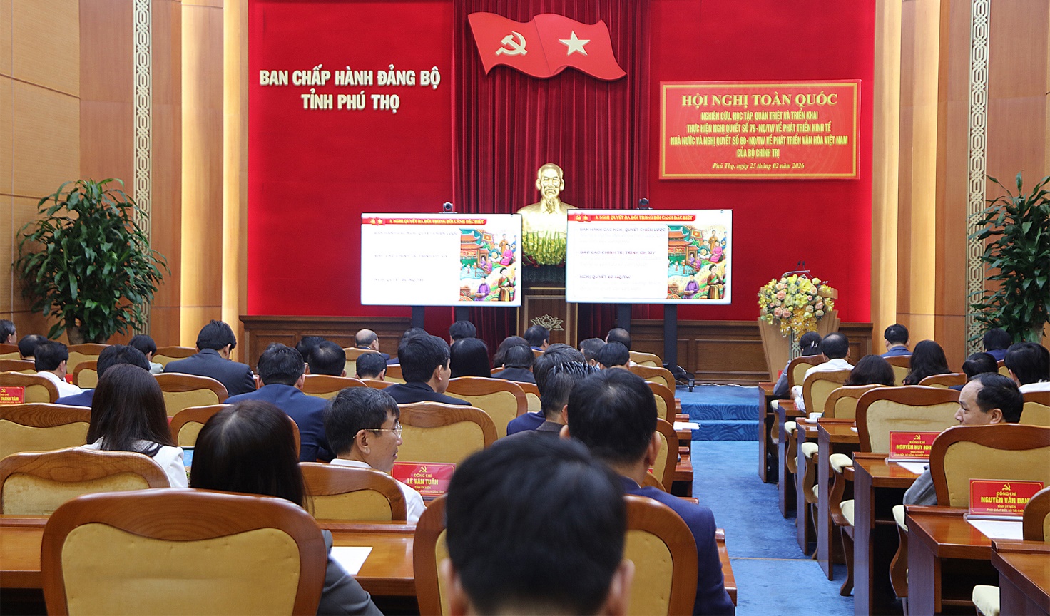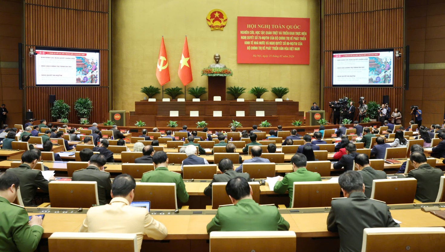 Hội nghị đã nghe các chuyên đề: "Nội dung trọng tâm, cốt lõi của Nghị quyết số 80-NQ/TW, ngày 07/01/2026 của Bộ Chính trị về phát triển văn hóa Việt Nam" do đồng chí Trịnh Văn Quyết, Ủy viên Bộ Chính trị, Bí thư Trung ương Đảng, Trưởng Ban Tuyên giáo và Dân vận Trung ương truyền đạt; "Nội dung trọng tâm, cốt lõi của Nghị quyết số 79-NQ/TW, ngày 06/01/2026 của Bộ Chính trị về phát triển kinh tế Nhà nước" do đồng chí Nguyễn Thanh Nghị, Ủy viên Bộ Chính trị, Bí thư Trung ương Đảng, Trưởng Ban Chính sách, chiến lược Trung ương truyền đạt; "Chương trình hành động thực hiện Nghị quyết số 79-NQ/TW và Nghị quyết số 80-NQ/TW" do Phó Thủ tướng Thường trực Chính phủ Nguyễn Hòa Bình truyền đạt.