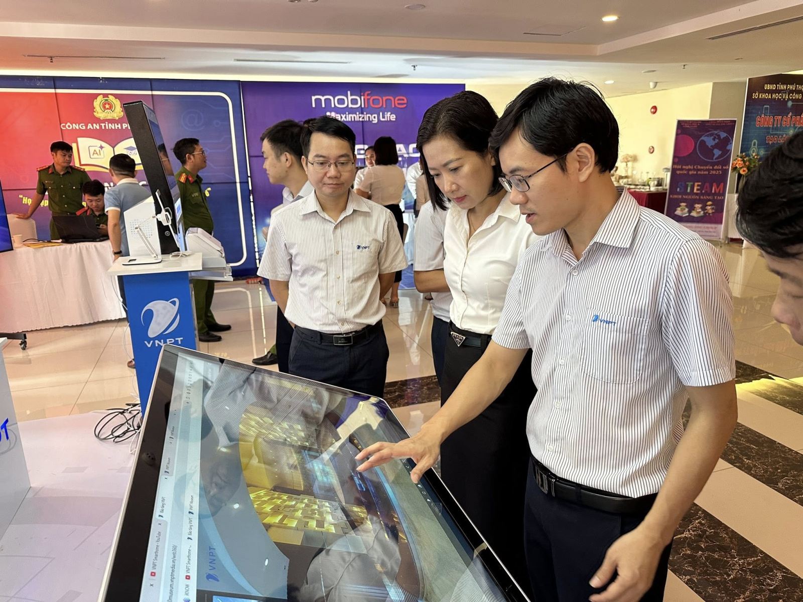 VNPT Phú Thọ giới thiệu khách tham quan gian hàng mô hình, nền tảng và giải pháp số phục vụ người dân, chính quyền, doanh nghiệp địa phương.