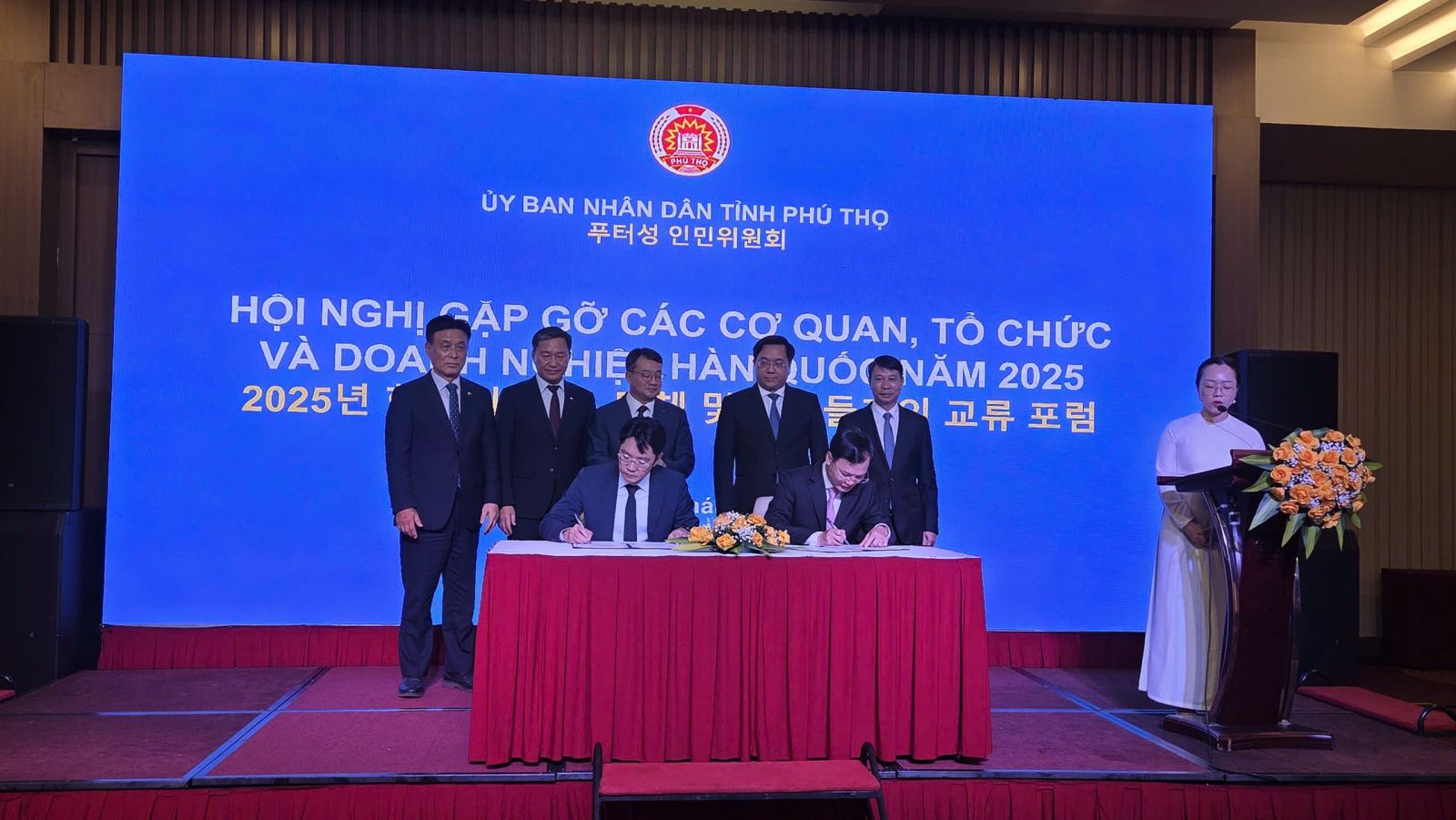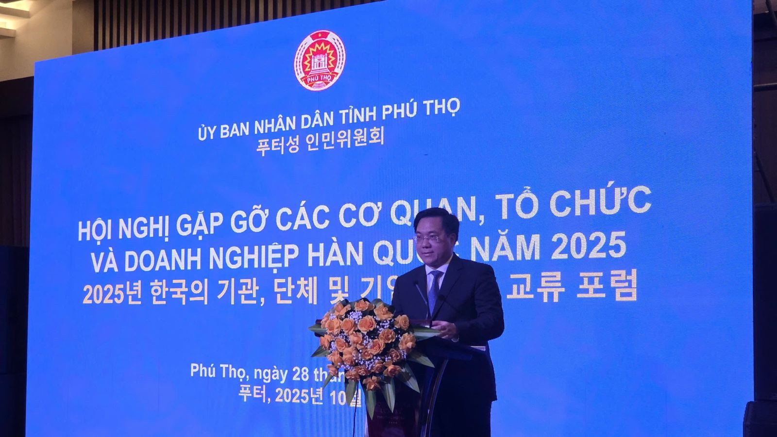 Chiều 28/10, UBND tỉnh Phú Thọ tổ chức Hội nghị gặp gỡ các cơ quan, tổ chức và Doanh nghiệp Hàn Quốc năm 2025. Đến dự có các đồng chí: Trần Duy Đông - Phó Bí thư Tỉnh ủy, Chủ tịch UBND tỉnh; Nguyễn Khắc Hiếu - Tỉnh ủy viên, Phó Chủ tịch UBND tỉnh; Đại sứ quán Hàn Quốc tại Việt Nam, Văn phòng Xúc tiến thương mại và Đầu tư Hàn Quốc (KOTRA), Hiệp hội doanh nghiệp Hàn Quốc tại Việt Nam (KOCHAM); cùng 150 doanh nghiệp, đai diện cho các doanh nghiệp Hàn Quốc đang sản xuất, kinh doanh và có trụ sở trên địa bàn tỉnh.