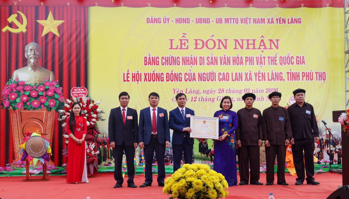Tại buổi lễ, Ban Tổ chức đã công bố Quyết định của Bộ trưởng Bộ Văn hóa - Thể thao và Du lịch về việc đưa Lễ hội Xuống đồng của người Cao Lan xã Yên Lãng vào Danh mục Di sản văn hóa phi vật thể quốc gia. Đồng thời, trao Chứng nhận cho đại diện Đảng bộ, chính quyền và Nhân dân địa phương.