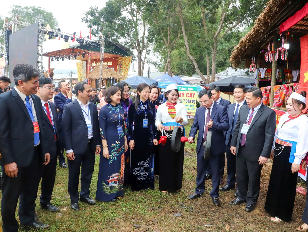 Các đồng chí lãnh đạo tỉnh tham quan không gian trưng bày văn hóa và trải nghiệm trình diễn chiêng Mường tại lễ hội