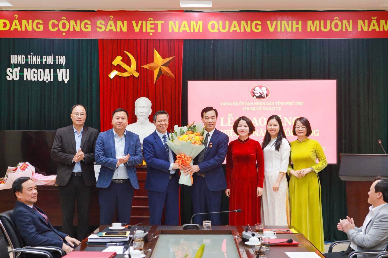 Tập thể lãnh đạo và Chi ủy Sở Ngoại vụ tặng hoa chúc mừng đồng chí Nguyễn Đắc Thuỷ.