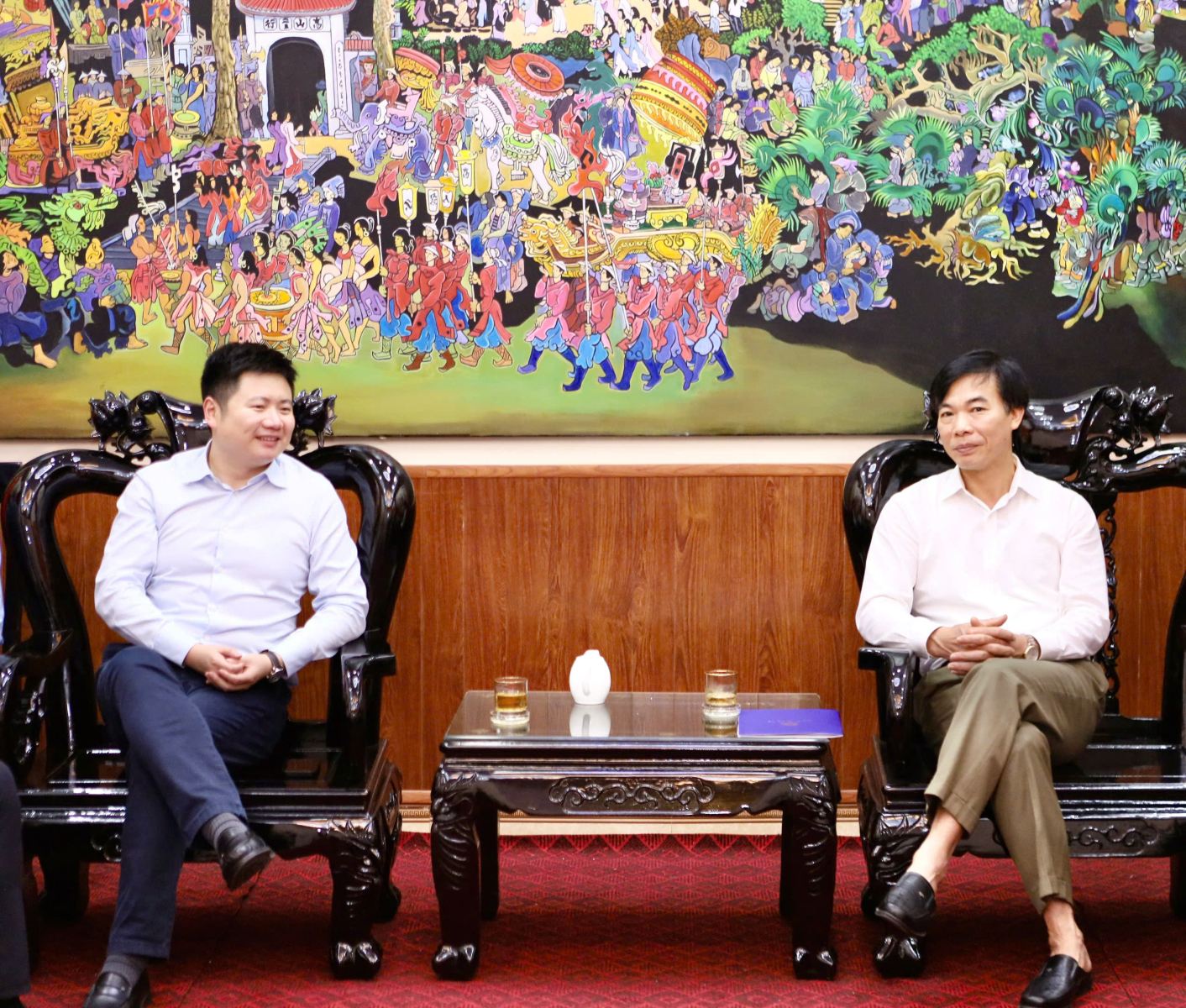 Giám đốc Sở Ngoại vụ Nguyễn Đắc Thủy và Chủ tịch Hội đồng Quản trị tập đoàn xây dựng Thái Bình Dương, Ông Trương Tường trao đổi tại buổi làm việc