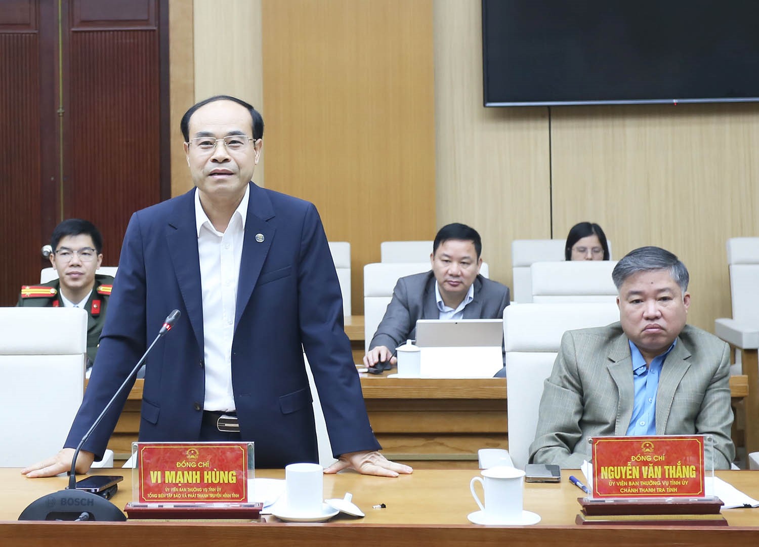 Đồng chí Vi Mạnh Hùng - Ủy viên Ban Thường vụ Tỉnh ủy, Giám đốc Báo và Phát thanh, Truyền hình tỉnh tham gia ý kiến về công tác tuyên truyền cuộc bầu cử