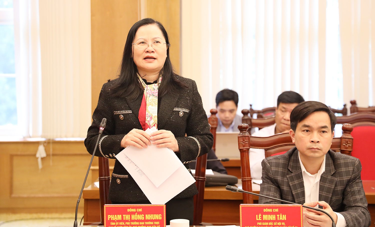 Phó Trưởng Ban Thường trực Ban Tổ chức Tỉnh ủy, Phó Trưởng Ban Bầu cử - đơn vị bầu cử số 3 Phạm Thị Hồng Nhung phát biểu tại hội nghị