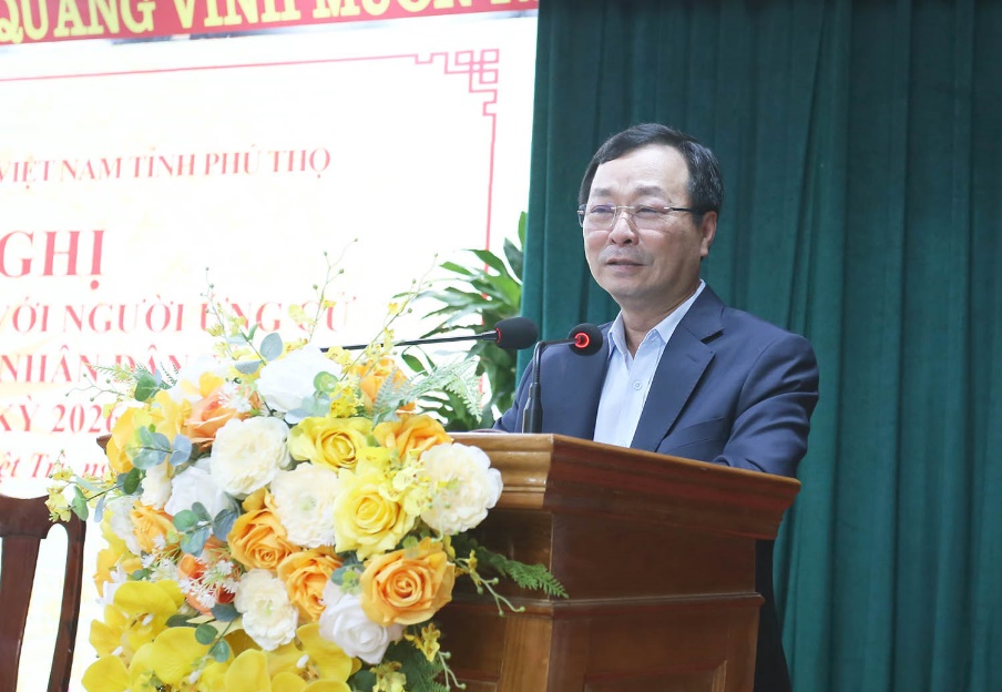 Thay mặt các ứng cử viên thuộc Đơn vị bầu cử số 14, Chủ tịch UBND tỉnh Trần Duy Đông thông tin tới cử tri tình hình phát triển kinh tế - xã hội của tỉnh sau sáp nhập, định hướng phát triển thời gian tới, cùng một số chủ trương, chính sách an sinh xã hội; quy hoạch, dự án giao thông và phát triển nhà ở xã hội trên địa bàn tỉnh.
